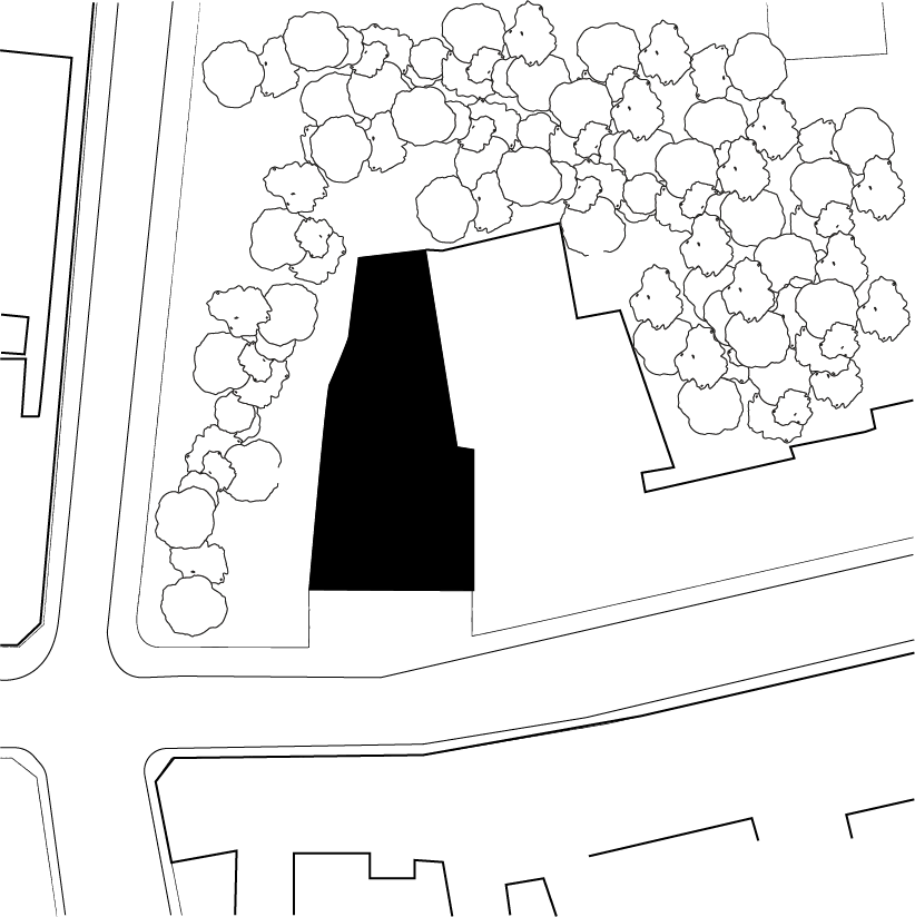 Ce terrain — à l’angle de deux rues — est pour moitié un espace boisé, classé et protégé. Cette particularité a évidemment posé les bases de notre proposition qui s’ouvre sur la partie boisée et se développe dans la profondeur de la parcelle. À l’origine, l’important dénivelé de terrain (en surplomb de la rue) était tenu par une suite de murs de soutènement. Ces murs ont été prolongés et forment le rez-de-chaussée qui abrite des espaces de vie en commun (100 m2 environ, incluant un espace-cuisine et une buanderie). C’est sur ce « socle » que vient se poser le corps principal du projet, un « monolithe » réalisé en bois. Ici, pour que le projet respecte au mieux l’implantation et le développement de la zone boisée, le corps principal du bâtiment se déforme en suivant la couronne des arbres existants.