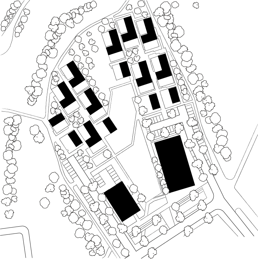 Dans l’axe de la coulée verte, l’Émergence s’élance en tant que marqueur urbain et crée, avec le bâtiment collectif, un cadrage urbain au profit du paysage de bocage. Entre ces deux bâtiments, le parvis planté marque la première séquence de ce parcours menant aux champs. L’architecture se fond progressivement au paysage autour d’une prairie longée par deux petits hameaux de maisons individuelles. Des venelles piétonnes plantées et deux placettes donnent au lieu une atmosphère de petit village où les espaces partagés, sont propices à l’appropriation par tous, dans le calme et la sérénité de la campagne toute proche.