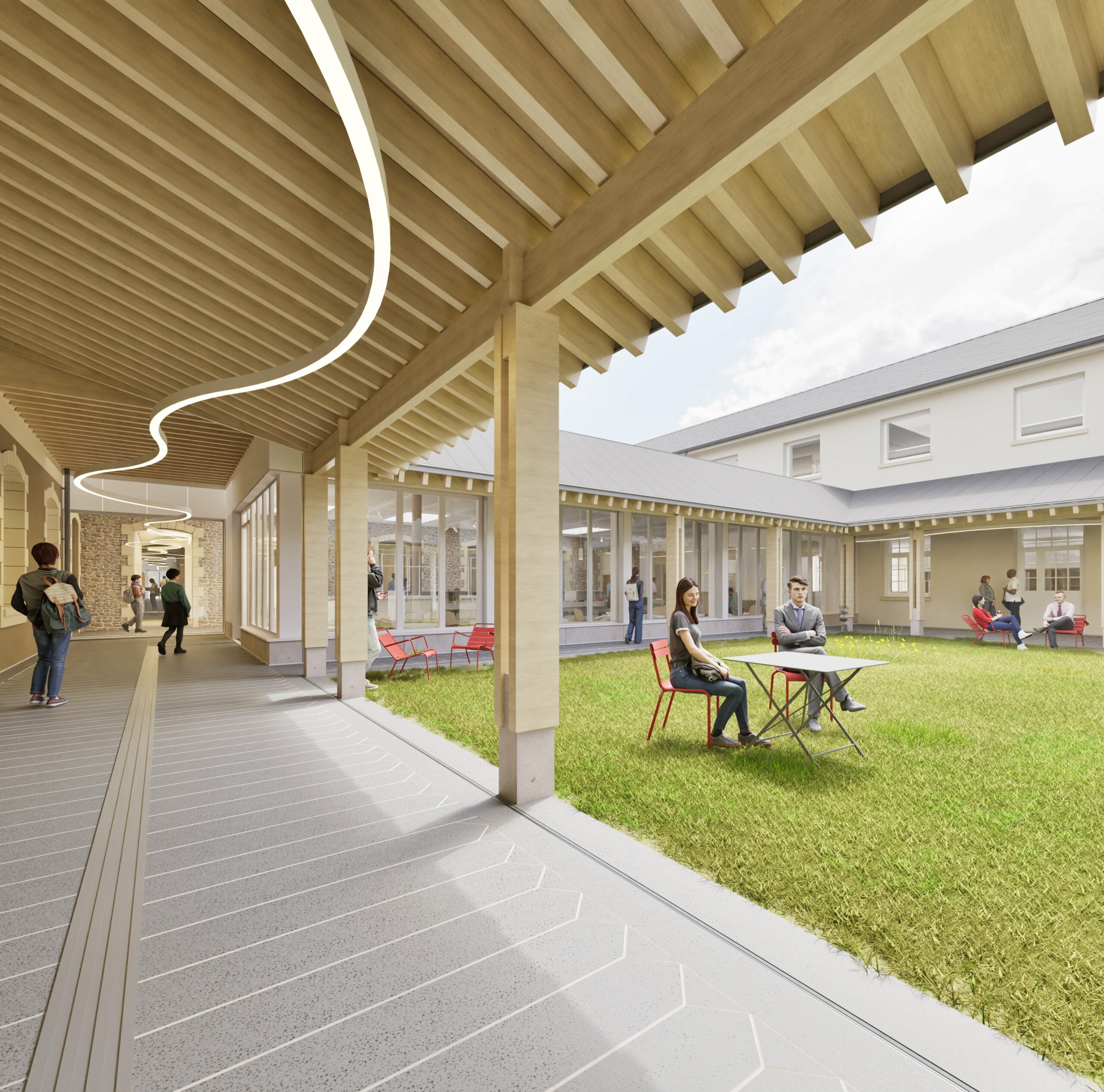 Le dessin proposé pour ce nouveau cloître reprend et réinterprète toutes les composantes du cloître de l’IEP. Les poteaux et les poutres en bois sont présents mais dépouillés de leurs ornements. Le béton remplace la pierre de soubassement et s’aligne parfaitement au poteau moisé. L’ensemble est protégé par une toiture en zinc s’alignant sur l’existant afin de marquer l’horizontale autour de la cour, caractéristique des cloîtres. Ainsi les codes architecturaux du cloître sont respectés : « cour en forme de quadrilatère entourée de galeries puis de murs ».