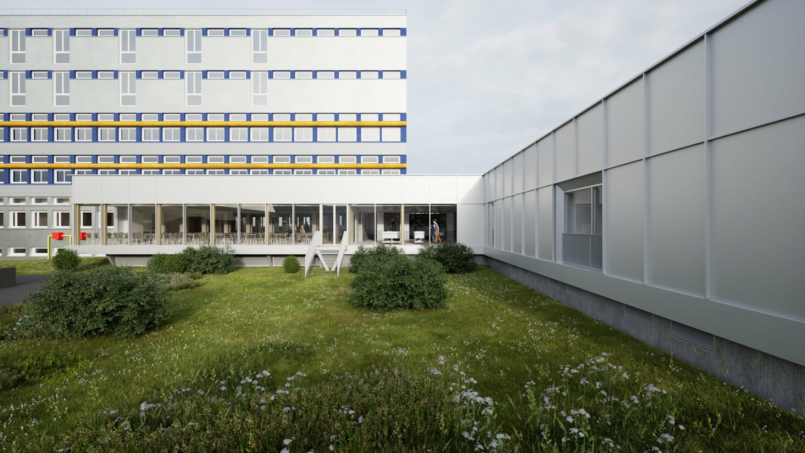 Les espaces de restauration sont entièrement repensés : réorganisation des flux, amélioration de la distribution, création de trois salles à manger distinctes et conception d’un nouveau hall d’accès. Une attention particulière est portée à la qualité des ambiances : lumière naturelle, vues dégagées, acoustique apaisée et matériaux durables.